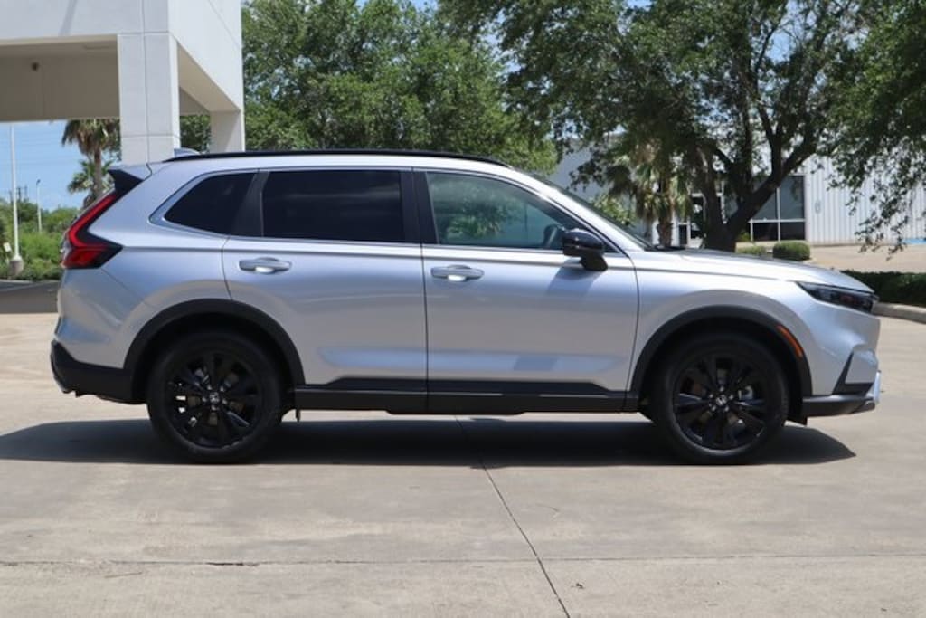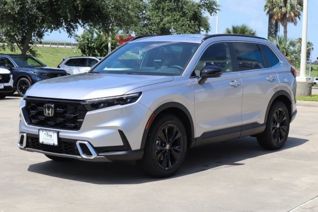 Solar Silver Metallic 2025 Honda CR-V Hybrid Sport Touring AWD eCVT 2.0L I4 DOHC 16V 12 Speakers, 4-Wheel Disc Brakes, ABS brakes, Adaptive Cruise Control: Adaptive Cruise Control (ACC) with Low-Speed Follow, Air Conditioning, Alloy wheels, AM/FM radio: SiriusXM, Auto High-beam Headlights, Automatic temperature control, Blind Spot Information (BSI) System warning, Brake assist, Compass, Delay-off headlights, Electronic Stability Control, Exterior Parking Camera Rear, Four wheel independent suspension, Front anti-roll bar, Front Bucket Seats, Front dual zone A/C, Fully automatic headlights, Heated door mirrors, Heated Front Bucket Seats, Heated front seats, Heated steering wheel, Illuminated entry, Leather Seat Trim, Leather Shift Knob, Leather steering wheel, Low tire pressure warning, Memory seat, Navigation system: Honda Satellite-Linked Navigation System, Outside temperature display, Panic alarm, Power door mirrors, Power driver seat, Power Liftgate, Power moonroof, Power passenger seat, Power steering, Power windows, Radio data system, Radio: Bose Premium Sound System w/Navigation, Rain sensing wipers, Rear anti-roll bar, Rear window defroster, Rear window wiper, Remote keyless entry, Security system, Speed control, Speed-sensing steering, Speed-Sensitive Wipers, Split folding rear seat, Spoiler, Steering wheel mounted audio controls, Telescoping steering wheel, Tilt steering wheel, Traction control, Trip computer, Turn signal indicator mirrors, Variably intermittent wipers, Wheels: 19" Berlina Black Alloy.