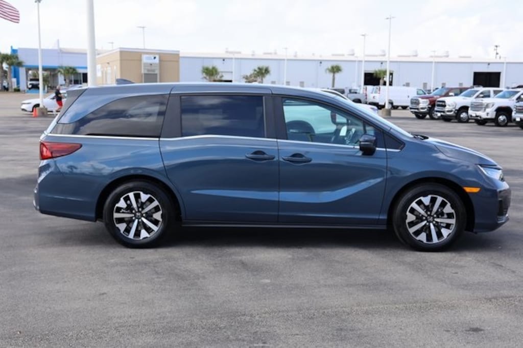 Smoke Blue Pearl 2026 Honda Odyssey EX-L FWD 10-Speed Automatic 3.5L V6 SOHC i-VTEC 24V 18" Machine-Finished Alloy Wheels, 3rd row seats: split-bench, 4-Wheel Disc Brakes, 7 Speakers, ABS brakes, Active Cruise Control, Adaptive Cruise Control: Adaptive Cruise Control (ACC) with Low-Speed Follow, Air Conditioning, Alloy wheels, AM/FM radio: SiriusXM, Anti-whiplash front head restraints, Apple CarPlay/Android Auto, Auto High-beam Headlights, Automatic temperature control, Blind Spot Information (BSI) System warning, Brake assist, Bumpers: body-color, Delay-off headlights, Electronic Stability Control, Exterior Parking Camera Rear, Four wheel independent suspension, Front anti-roll bar, Front Bucket Seats, Front dual zone A/C, Front fog lights, Fully automatic headlights, Garage door transmitter: HomeLink, Heated door mirrors, Heated Front Bucket Seats, Heated front seats, Illuminated entry, Lane departure: Lane Keeping Assist System (LKAS) active, Leather steering wheel, Leather-Trimmed Seats, Low tire pressure warning, Memory seat, Occupant sensing airbag, Outside temperature display, Panic alarm, Power door mirrors, Power driver seat, Power Liftgate, Power moonroof, Power passenger seat, Power steering, Power windows, Radio data system, Radio: 160-Watt AM/FM/HD/SiriusXM Audio System, Rear air conditioning, Rear anti-roll bar, Rear window defroster, Rear window wiper, Reclining 3rd row seat, Remote keyless entry, Security system, Speed control, Speed-sensing steering, Speed-Sensitive Wipers, Split folding rear seat, Spoiler, Steering wheel mounted audio controls, Tachometer, Telescoping steering wheel, Tilt steering wheel, Traction control, Trip computer, Turn signal indicator mirrors, Variably intermittent wipers.
