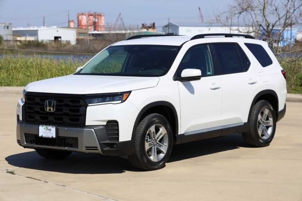 Platinum White Pearl 2026 Honda Pilot EX-L FWD 10-Speed Automatic 3.5L V6 DOHC 24V 3rd row seats: split-bench, 4-Wheel Disc Brakes, 9 Speakers, ABS brakes, Adaptive Cruise Control: Adaptive Cruise Control (ACC) with Low-Speed Follow, Air Conditioning, Alloy wheels, Apple CarPlay/Android Auto, Auto High-beam Headlights, Automatic temperature control, Blind Spot Information (BSI) System warning, Brake assist, Compass, Delay-off headlights, Electronic Stability Control, Emergency communication system: HondaLink, Exterior Parking Camera Rear, Four wheel independent suspension, Front anti-roll bar, Front Bucket Seats, Front Center Armrest, Front dual zone A/C, Front fog lights, Fully automatic headlights, Heated door mirrors, Heated Front Bucket Seats, Heated front seats, HondaLink, HondaLink Subscription Services, Illuminated entry, Lane departure: Lane Keeping Assist System (LKAS) active, Leather-Trimmed Seat Trim with Fabric Accent, Low tire pressure warning, Memory seat, Navigation system: Google Maps, Outside temperature display, Panic alarm, Power door mirrors, Power Liftgate, Power passenger seat, Power steering, Power windows, Radio data system, Radio: 245-Watt Audio System, Rear air conditioning, Rear anti-roll bar, Rear window defroster, Rear window wiper, Reclining 3rd row seat, Remote keyless entry, Security system, Speed control, Speed-sensing steering, Speed-Sensitive Wipers, Split folding rear seat, Spoiler, Steering wheel mounted audio controls, Tachometer, Telescoping steering wheel, Tilt steering wheel, Traction control, Trip computer, Turn signal indicator mirrors, Variably intermittent wipers, Wheels: 18" Pewter Gray Machined Face. Price includes: $1250 - Loyalty/Conquest. Exp. 04/30/2026